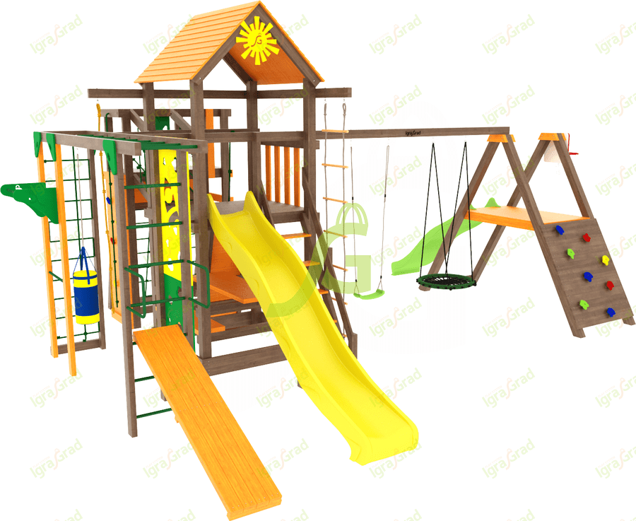 Детская площадка Спорт 3 - это большой игровой комплекс для детей от 3 до 12 лет. Она предлагает множество спортивных и игровых элементов, которые помогут ребенку активно проводить время на свежем воздухе. Главная особенность этой площадки - две горки разной высоты и обилие спортивных снарядов. В центре комплекса - двухуровневая башня с крышей. От нее отходят две волновые горки длиной 3 и 2,2 метра, а также качельный модуль с одиночными качелями и качелями-гнездом. Для физического развития предусмотрены скалодром со скатом, модуль для лазания, рукоход, турник, силовая скамья, груша, баскетбольное кольцо, деревянная и веревочная лестницы, канат с тремя узлами и веревочная сетка. Также есть столик с лавочками для отдыха. Площадка изготовлена из клееного бруса 90х90 мм, который обработан специальной пропиткой для защиты от влаги и вредителей. Все деревянные элементы приятны на ощупь и не нагреваются на солнце. Крепежные элементы оцинкованы, что предотвращает коррозию. Конструкция соответствует требованиям ГОСТ, обеспечивая безопасность во время игр. Площадка поставляется по всей России, до терминала транспортной компании в вашем городе доставка бесплатная. Вы можете собрать комплекс самостоятельно за 1-2 дня, используя подробное руководство. Если вы предпочитаете, наши специалисты готовы выполнить профессиональную сборку на вашем участке.