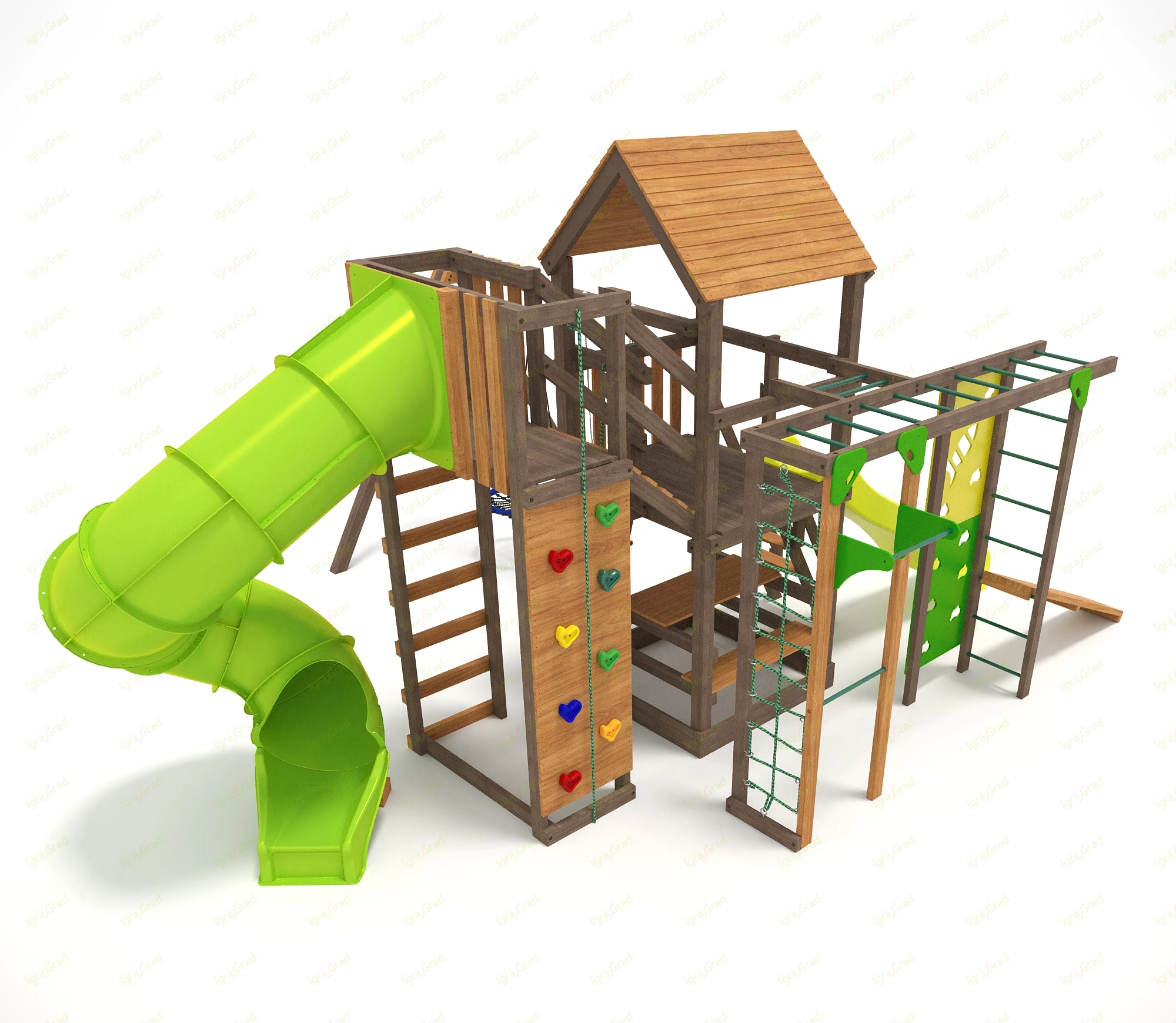 В комплект Спорт 6 входит: длина: 6,7 м, ширина: 5,37 м, высота: 3,47 м, артикул: igragrad_sport_6. Все элементы обработаны защитным покрытием, безопасным для детей. Сертификация по ГОСТ.