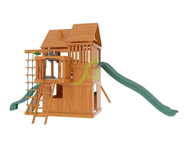Детская площадка Великан 2 (Домик) - это большой игровой комплекс для детей от 3 до 12 лет. Ее главная особенность - двухуровневый домик, напоминающий сказочный теремок, с двумя горками разной высоты, который станет центром притяжения для активных игр. Площадка оборудована разнообразными элементами для развития и развлечения. Здесь есть две волнообразные горки - одна для самых маленьких, другая для ребят постарше. Подняться на платформы можно по скалодрому с разноцветными камнями, веревочной или деревянной лестнице. Качельный модуль включает две гибкие качели на цепях и трапецию с кольцами. В домике предусмотрены пластиковые окошки, доска для игры в "Крестики-нолики", бинокль и руль, а также лавочка-столик для отдыха или настольных игр. Все деревянные элементы площадки выполнены из клееного бруса, обработанного безопасной пропиткой, которая защищает дерево от влаги, грибка и насекомых. Для сборки используется оцинкованный крепеж, устойчивый к коррозии. Конструкция соответствует требованиям ГОСТ, что гарантирует ее надежность и безопасность во время активных игр. Размеры площадки: длина 7,85 м, ширина 6,3 м, высота 3,9 м. Мы доставляем площадки по всей России. Доставка до терминала транспортной компании в вашем городе бесплатна. Вы можете собрать комплекс самостоятельно за 1-2 дня, следуя подробной инструкции, или воспользоваться услугами наших опытных мастеров по сборке.