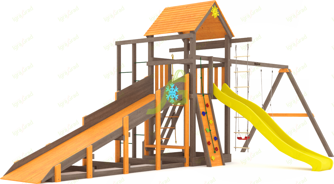 Всесезонная площадка С Форт с сеткой SF1 - это полноценный игровой городок для детей от 3 до 12 лет. Главная особенность этой модели - возможность установки зимней горки, которая превращает площадку в центр развлечений даже в холодное время года. Площадка включает в себя башню с крышей, волновой скат длиной 3 метра, а также качельный модуль с двумя видами качелей - одиночными и со спинкой. Для активного лазания предусмотрены скалодром с цветными камнями, деревянная и веревочная лестницы, а также канат. В основании башни расположена просторная песочница, которая подарит много часов творческих игр. Конструкция площадки выполнена из клееного бруса 90х90 мм, что обеспечивает ей высокую прочность и долговечность. Все деревянные элементы обработаны безопасными пропитками, защищающими от гниения и вредителей. Крепежные элементы оцинкованы, что предотвращает коррозию. Площадка разработана с учетом требований ГОСТ, гарантируя безопасность ваших детей. Мы доставляем площадки по всей России. Доставка до терминала транспортной компании в вашем городе осуществляется бесплатно. Вы можете собрать площадку самостоятельно за 1-2 дня, следуя подробной инструкции, или воспользоваться услугами наших опытных мастеров.