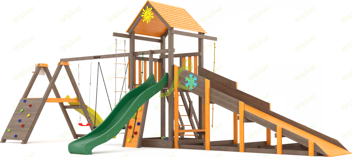 Площадка С Грайд мод.1 SF1 - это всесезонный игровой комплекс, который подойдет для детей от 3 до 12 лет. Главная особенность этой модели - две горки разной высоты, что позволяет играть и малышам, и ребятам постарше. В состав площадки входит башня, скалодром с камнями и деревянная лестница для подъема. Зимняя горка и две волновые горки - 3 метра и 2,2 метра - подарят много веселых спусков. Качельный модуль оборудован качелями-гнездом "паутинка" диаметром 100 см и одиночными качелями. Спортивный модуль А-образной формы дополнен веревочной лестницей, канатом с тремя узлами и веревочной сеткой для лазания. Также есть баскетбольное кольцо для активных игр. Конструкция площадки выполнена из клееного бруса 90х90 мм, что обеспечивает прочность и долговечность. Все деревянные элементы пропитаны безопасными составами, защищающими от влаги и вредителей. Для креплений используется оцинкованный крепеж, устойчивый к коррозии. Площадка соответствует стандартам ГОСТ и безопасна для детей. Доставка осуществляется по всей России. Мы бесплатно доставим ваш заказ до терминала транспортной компании. Собрать площадку можно самостоятельно за 1-2 дня, используя подробное руководство. Также вы можете заказать услугу профессиональной сборки у наших мастеров.
