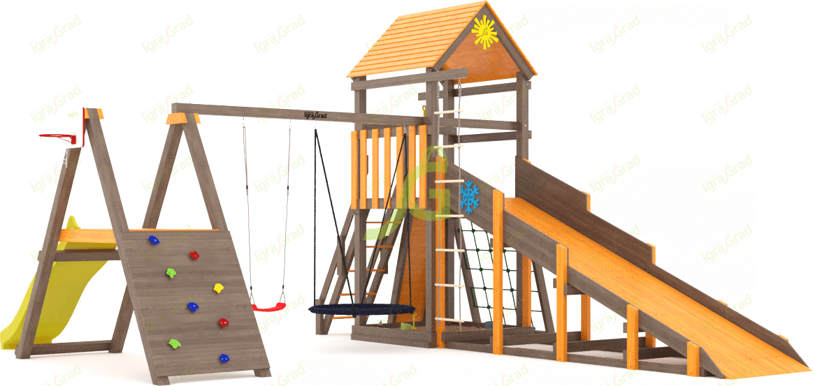Площадка С Грайд мод.1 SF2 - это большой игровой комплекс для детей от 3 до 12 лет. Она создана для активных игр на свежем воздухе и подходит для использования круглый год, благодаря особенной зимней горке. На этой площадке есть все для веселья: две волновые горки разной длины (3 и 2,2 метра), скалодром с камнями, деревянная и веревочная лестницы. Для любителей покачаться предусмотрен качельный модуль с качелями-гнездом "паутинка" и одиночными качелями. Спортивный модуль А-образной формы, канат с узлами, веревочная сетка для лазания и баскетбольное кольцо дополняют список развлечений. Площадка С Грайд мод.1 SF2 изготовлена из клееного бруса 90х90 мм, что обеспечивает прочность и долговечность конструкции. Все деревянные элементы обработаны безопасными пропитками, которые защищают дерево от влаги и вредителей. Крепеж оцинкован, что предотвращает коррозию. Площадка соответствует требованиям ГОСТ, что гарантирует безопасность для ваших детей. Мы доставляем площадки по всей России. До терминала транспортной компании в вашем городе доставка бесплатна. Вы можете собрать комплекс самостоятельно за 1-2 дня, используя подробное руководство, или заказать услугу сборки у наших мастеров.