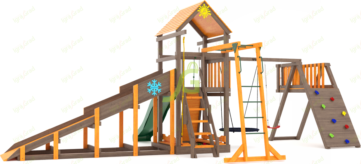 Всесезонная площадка С Грайд мод.2 SF2 - это большой игровой комплекс для детей от 3 до 12 лет. Она создана для активных игр на свежем воздухе круглый год, а ее главная особенность - наличие двух горок, одна из которых предназначена для использования зимой. Площадка оборудована разнообразными элементами для развития ловкости и силы. Здесь есть скалодром с камнями, волновая горка длиной 3 метра, а также отдельная зимняя горка. Для любителей покачаться предусмотрен качельный модуль с качелями-гнездом диаметром 100 см и одной классической одиночной качелью. Спортивный модуль А-образной формы включает рукоход, деревянную и веревочную лестницы, канат с тремя узлами. Дополняет список развлечений баскетбольное кольцо. Конструкция площадки выполнена из клееного бруса сечением 90х90 мм, что обеспечивает ей высокую прочность и долговечность. Все деревянные элементы обработаны специальной пропиткой, которая защищает их от влаги, ультрафиолета и вредителей. Для крепления используются оцинкованные метизы, устойчивые к коррозии. Площадка соответствует стандартам безопасности ГОСТ, что гарантирует надежность и безопасность для ваших детей. Мы доставляем площадки по всей России. Доставка до терминала транспортной компании в вашем городе осуществляется бесплатно. Вы можете собрать площадку самостоятельно за 1-2 дня, следуя подробной инструкции, которая идет в комплекте. Если вы предпочитаете доверить сборку профессионалам, наши мастера окажут эту услугу.