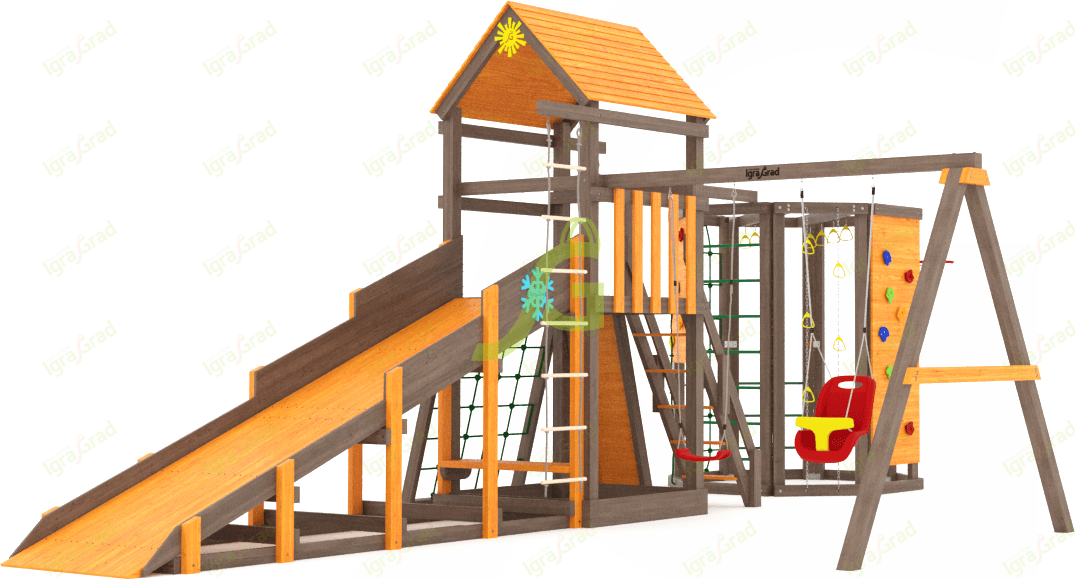 Всесезонная площадка С Грайд с Воркаут SF1 - это полноценный игровой комплекс для детей от 3 до 12 лет. Ее главная особенность - возможность использования круглый год благодаря наличию зимней горки, которая легко устанавливается на место волновой. Ваши дети найдут здесь множество занятий: от скоростного спуска с волновой горки до лазания по скалодрому с камнями и веревочной лестнице. Есть рукоход, канат с узлами и спортивный игровой комплекс WorkOut для развития силы и ловкости. Качельный модуль включает одиночные качели и качели со спинкой, а песочница подарит часы творческих игр. Деревянная лестница обеспечит удобный подъем на башню. Площадка изготовлена из клееного бруса 90х90 мм, что гарантирует прочность и долговечность конструкции. Все детали тщательно обработаны, а открытые поверхности защищены специальной пропиткой от влаги и вредителей. Крепеж оцинкован, что предотвращает появление ржавчины. Мы уделяем особое внимание безопасности, поэтому все элементы соответствуют требованиям ГОСТ. Доставка площадки осуществляется по всей России, до терминала транспортной компании в вашем городе мы привезем ее бесплатно. Собрать комплекс можно самостоятельно за 1-2 дня, используя подробное руководство. Если вы предпочитаете доверить это дело профессионалам, наши мастера готовы выполнить сборку на вашем участке.
