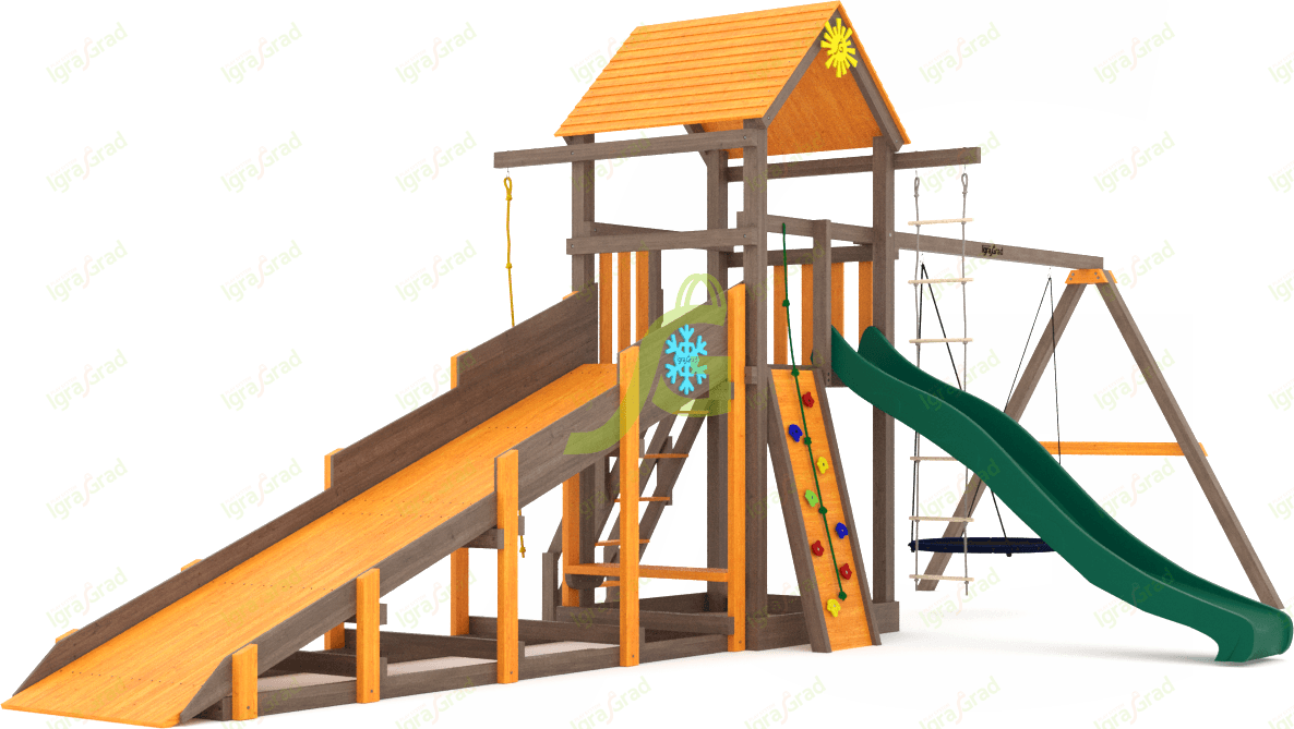 Всесезонная площадка С Нест SF2 - это комплекс для детей от 3 до 12 лет, который позволяет играть на свежем воздухе круглый год. Главная особенность этой модели - наличие двух горок, одна из которых предназначена для использования в холодное время года. На этой площадке ваш ребенок найдет множество активностей: башня с деревянной лестницей, волновой спуск длиной 3 метра, скалодром с камнями для развития ловкости. Качельный модуль включает качели-гнездо диаметром 100 см, где можно качаться одному или с другом. Дополнительно есть веревочная лестница и канат с тремя узлами для тренировки силы и координации. В основании башни предусмотрена песочница. Площадка изготовлена из клееного бруса 90х90 мм, который устойчив к деформациям и перепадам температур. Все деревянные элементы обработаны специальной пропиткой, защищающей от влаги и ультрафиолета. Крепеж выполнен из оцинкованной стали, что предотвращает коррозию. Конструкция соответствует требованиям ГОСТ, обеспечивая безопасность во время игр. Мы доставляем площадки по всей России, до терминала транспортной компании в вашем городе - бесплатно. Сборка занимает 1-2 дня, вы можете собрать комплекс самостоятельно, используя подробное руководство. Если вы предпочитаете доверить эту работу профессионалам, наши мастера соберут площадку на вашем участке. Услуга сборки оплачивается дополнительно.
