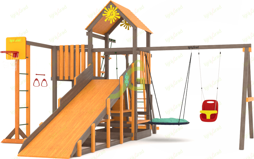 В комплект Всесезонная площадка С с балконом мод.2 SF входит: длина: 7,07 м, ширина: 5,04 м, высота: 3,25 м, артикул: igragrad_c_balc_mod2_sf. Все элементы обработаны защитным покрытием, безопасным для детей. Сертификация по ГОСТ.