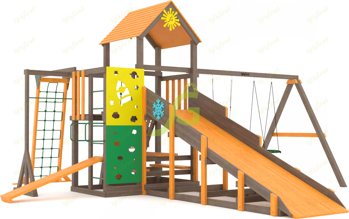 Всесезонная площадка С Спорт 4 SF - это комплекс для детей от 3 до 12 лет, который сочетает игровые и спортивные элементы. Ее главная особенность - возможность использовать горку как в теплое время года, так и зимой. Комплекс включает в себя множество активностей. Здесь есть волновая горка длиной 3 метра, которая летом подарит яркие эмоции, а зимой легко превратится в снежный спуск. Для развития ловкости предусмотрены скалодром с цветными камнями и веревочная сетка. Качельный модуль оборудован одиночными качелями и качелями-гнездом "паутинка" диаметром 100 см. Также в составе площадки - рукоход, турник, силовая скамья и баскетбольное кольцо. Деревянная лестница с перилами обеспечивает удобный и безопасный подъем. Дополнительно имеется столик с лавочками для отдыха или настольных игр. Площадка изготовлена из клееного бруса сечением 90х90 мм, что обеспечивает прочность и долговечность конструкции. Все деревянные элементы обработаны специальной пропиткой, которая защищает от влаги, ультрафиолета и вредителей, продлевая срок службы. Для надежного соединения деталей используется оцинкованный крепеж, устойчивый к коррозии. Все материалы и конструкция соответствуют стандартам ГОСТ, что гарантирует безопасность вашего ребенка во время игр. Мы доставляем площадки по всей России. Доставка до терминала транспортной компании в вашем городе осуществляется бесплатно. Вы можете собрать площадку самостоятельно за 1-2 дня, следуя подробной инструкции, или воспользоваться услугами наших опытных мастеров. Обратите внимание, кронштейны типа "Якорь" для крепления к грунту приобретаются отдельно.