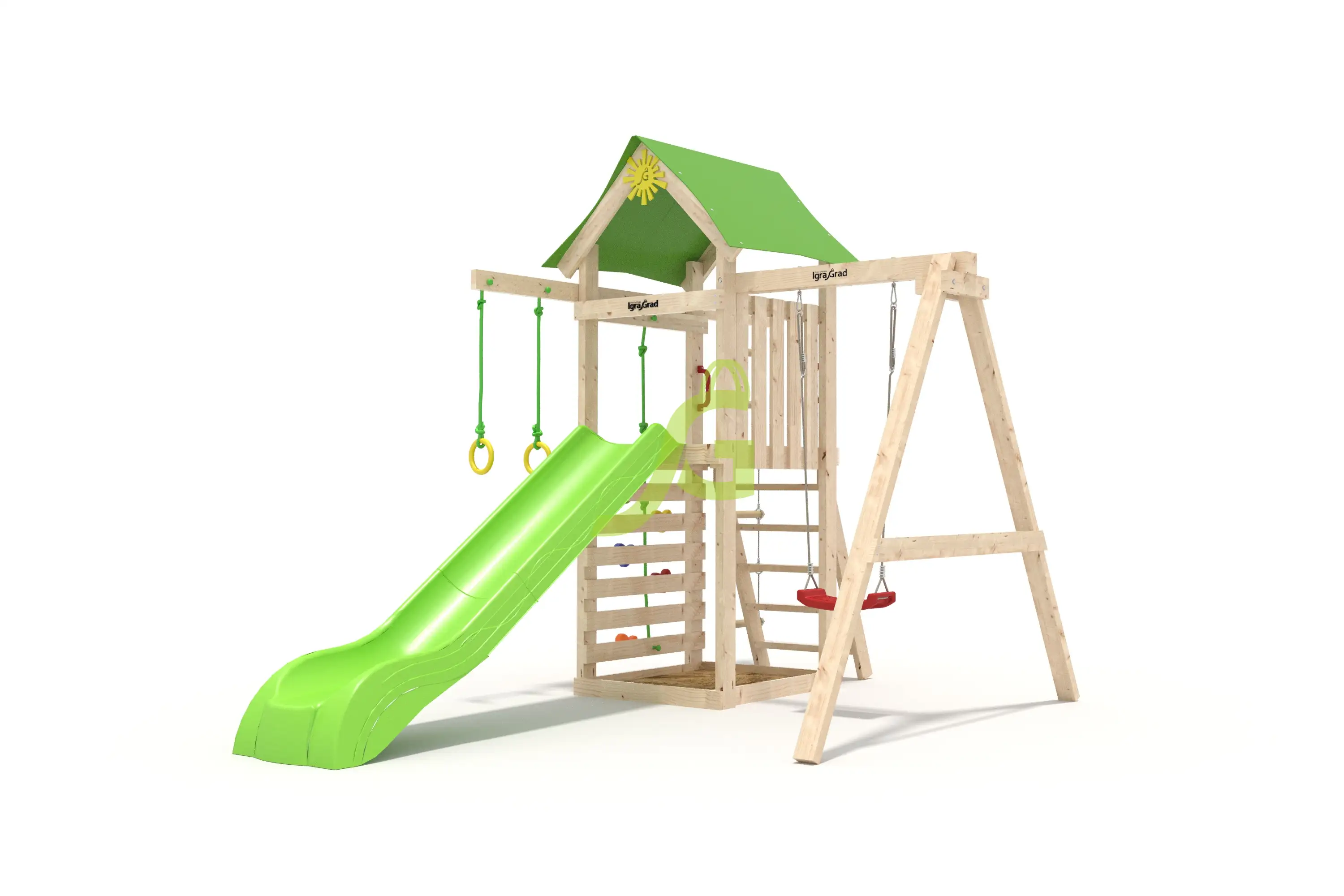 В комплект W1-1 входит: длина: 3,28 м, ширина: 2,31 м, высота: 2,65 м, артикул: igragrad-w1-1-v4. Все элементы обработаны защитным покрытием, безопасным для детей. Сертификация по ГОСТ.