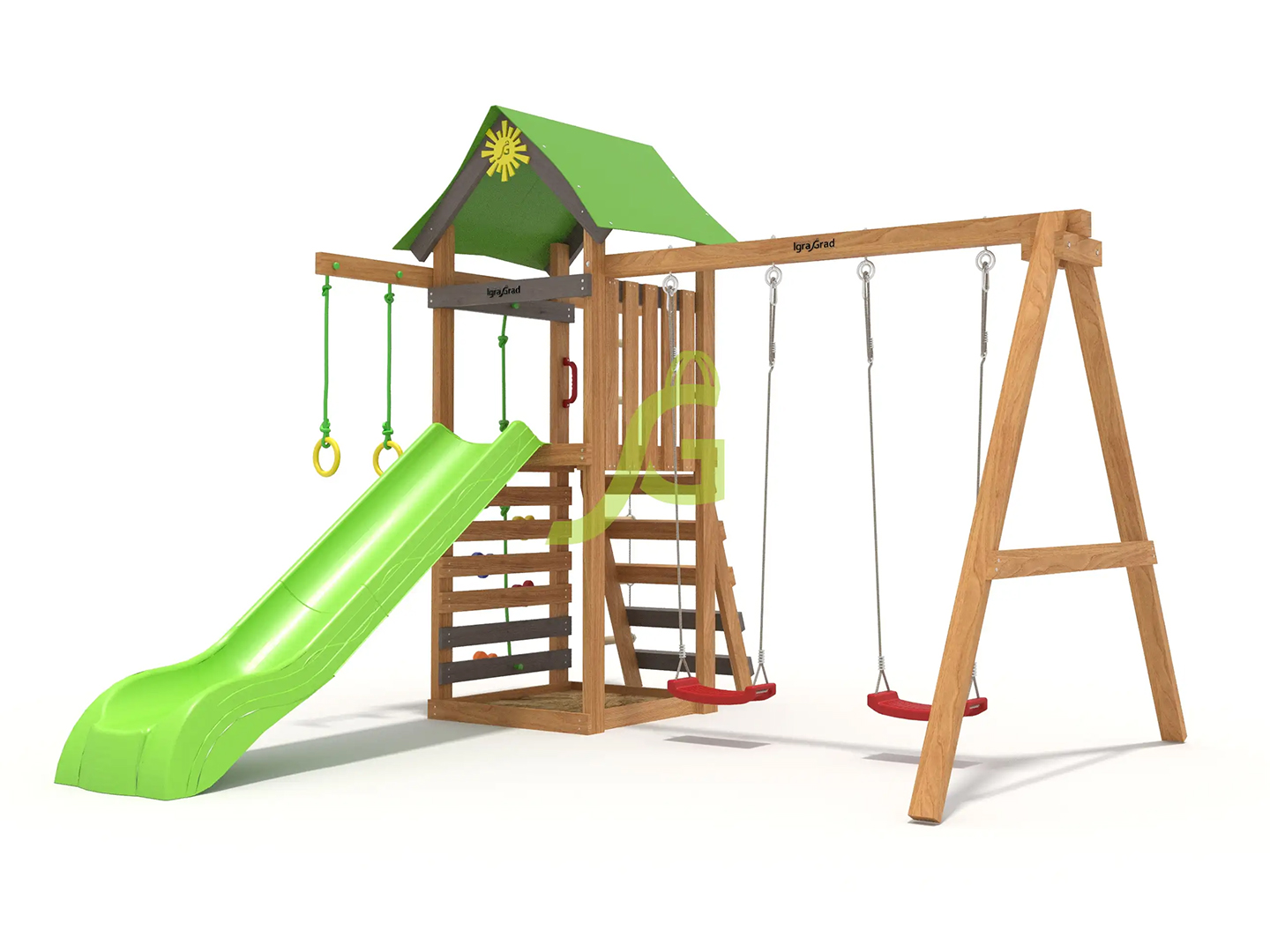 Детская площадка W1-1s - это компактное решение для активного отдыха детей от 3 до 11 лет. Она предлагает разнообразные элементы для игр на свежем воздухе, при этом не занимает много места на вашем участке. Эта модель включает в себя волновую горку длиной 2,2 метра, две одиночные качели "лодочка" для веселых полетов, и скалодром с зацепами, чтобы развивать ловкость. Также есть деревянная и веревочная лестницы, гимнастические кольца и канат. Под платформой расположена песочница, а тентовая крыша защитит от солнца. Для удобства предусмотрены пластиковые ручки. Площадка изготовлена из клееного бруса, который обработан специальной пропиткой для защиты от влаги и вредителей. Все металлические элементы, включая крепеж, оцинкованы, что предотвращает коррозию. Конструкция соответствует требованиям ГОСТ, что гарантирует безопасность во время игр. Мы доставляем площадки по всей России, бесплатно доставляя их до терминала транспортной компании. Вы можете собрать площадку самостоятельно за 1-2 дня, следуя инструкции, или заказать услугу сборки у наших опытных мастеров.