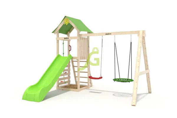 W1 с гнездом - деревянная детская площадка для детей 3-11 лет. Размеры 3,05 x 2,78 x 2,65 м. Качественный клееный брус, надежные крепления, иллюстрированная инструкция по сборке.