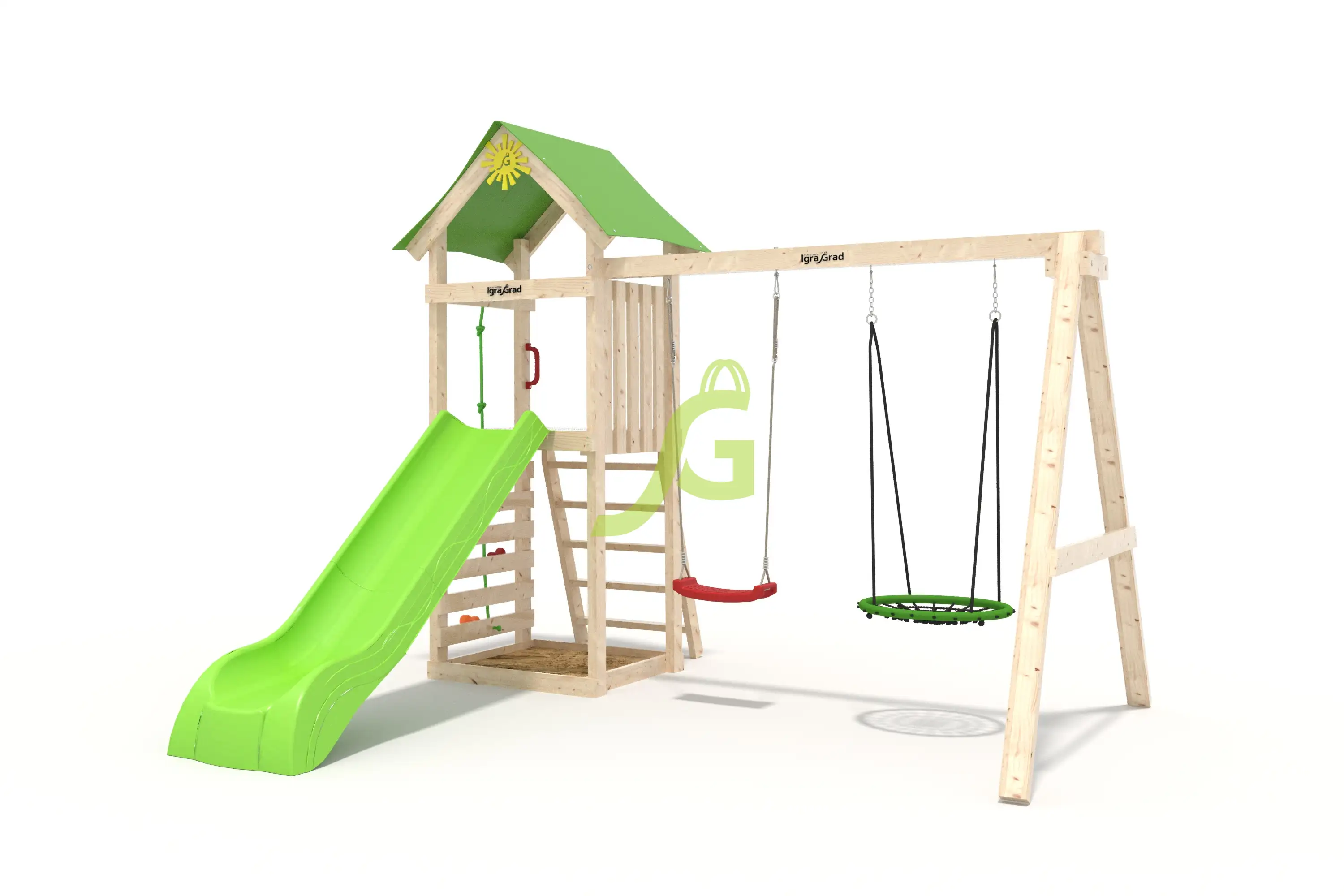 В комплект W1 с гнездом входит: длина: 2,78 м, ширина: 3,05 м, высота: 2,65 м, артикул: igragrad-w1-gn-v4. Все элементы обработаны защитным покрытием, безопасным для детей. Сертификация по ГОСТ.