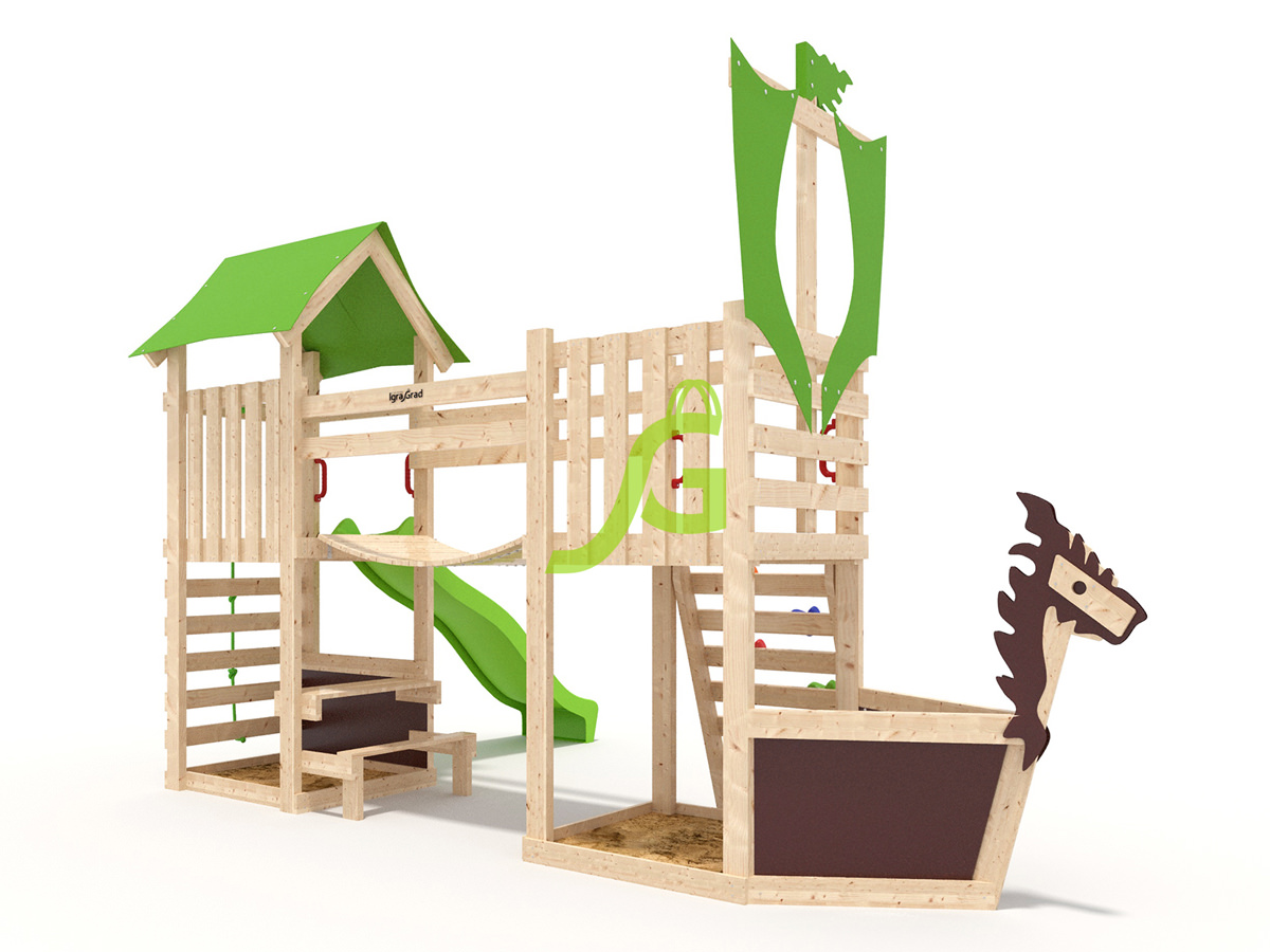 Детская площадка W19 - это целый игровой комплекс для детей от 3 до 12 лет, который вдохновлен тематикой корабля викингов. С ней ваш ребенок сможет отправиться в увлекательное путешествие, не выходя за пределы дачного участка. Площадка включает в себя две башни, соединенные надежным деревянным мостиком, что позволяет перемещаться между игровыми зонами. Здесь есть волновая горка длиной 2,2 метра, скалодром с цветными зацепами и канат для развития ловкости. Для малышей предусмотрены две песочницы, одна из которых оформлена в виде корабля с "драконом", а другая дополнена столиком-лавочкой. Тентовая крыша защитит от солнца, а пластиковые ручки обеспечат дополнительную безопасность. Все деревянные элементы площадки изготовлены из клееного бруса, обработанного безопасными пропитками, которые защищают древесину от влаги и вредителей. Крепежные элементы оцинкованы, что предотвращает появление ржавчины и продлевает срок службы конструкции. Площадка полностью соответствует ГОСТам и европейским стандартам безопасности, поэтому вы можете быть уверены в надежности и качестве изделия. Мы доставляем площадки по всей России, бесплатно довезем ваш заказ до терминала транспортной компании. Сборка площадки займет у вас 1-2 дня, если вы решите сделать это самостоятельно, следуя подробной инструкции. Если же вы хотите сэкономить время, наши опытные мастера готовы приехать и собрать площадку на вашем участке.