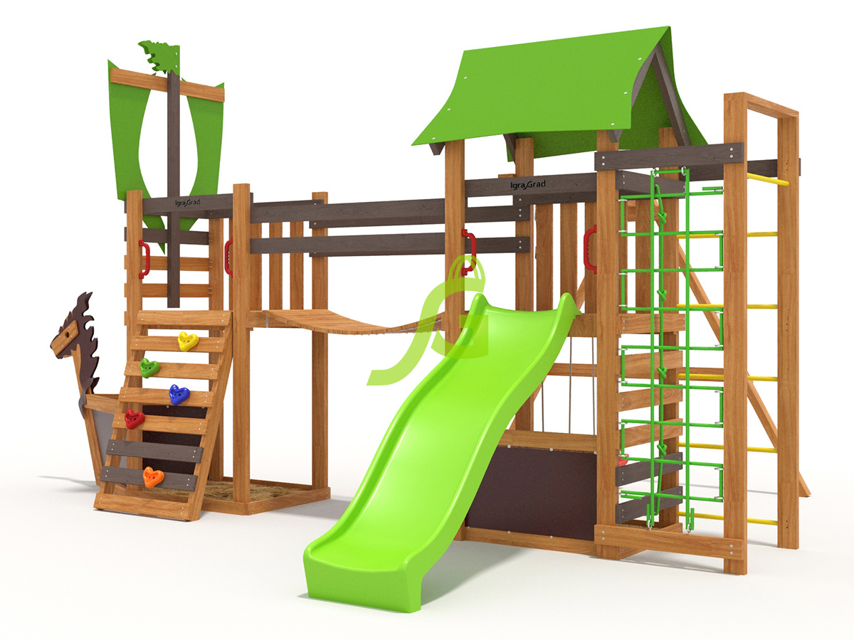 В комплект W20s Спорт входит: длина: 4,67 м, ширина: 4,72 м, высота: 2,88 м, артикул: igragrad-w20s-sport-v4. Все элементы обработаны защитным покрытием, безопасным для детей. Сертификация по ГОСТ.