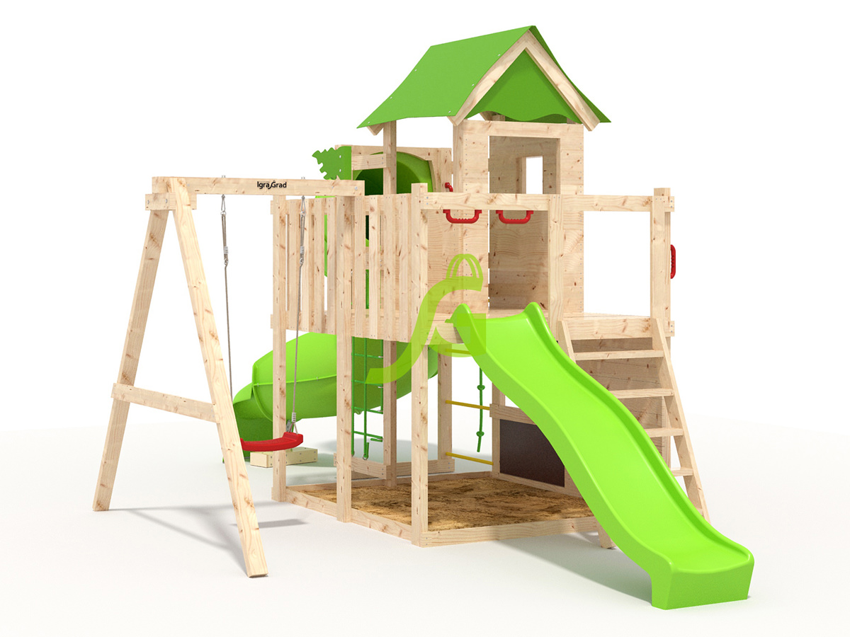 В комплект W33 входит: длина: 5,35 м, ширина: 3,56 м, высота: 2,98 м, артикул: igragrad-w33-v4. Все элементы обработаны защитным покрытием, безопасным для детей. Сертификация по ГОСТ.