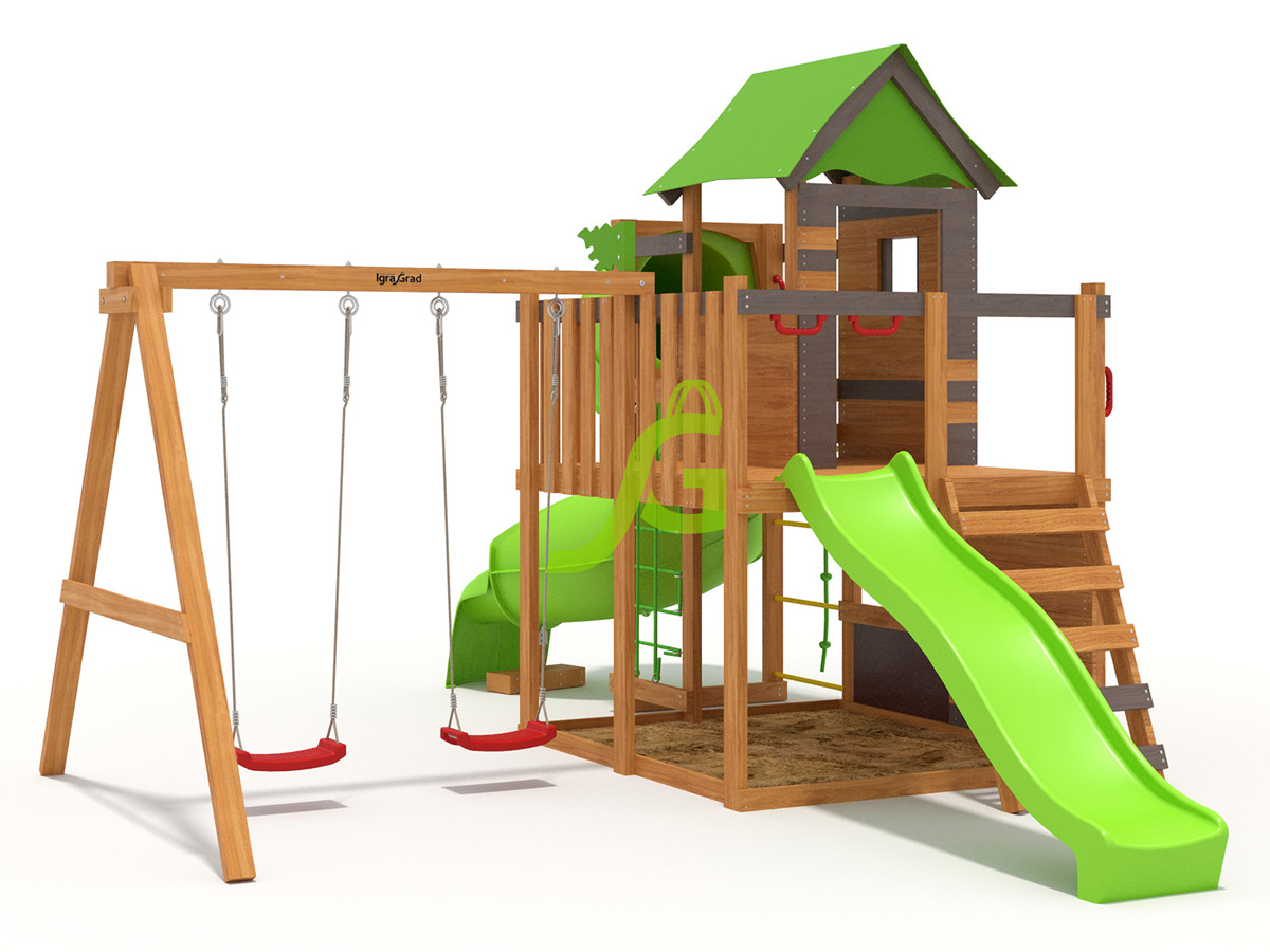 В комплект W33s входит: длина: 5,35 м, ширина: 4,30 м, высота: 2,98 м, артикул: igragrad-w33s-v4. Все элементы обработаны защитным покрытием, безопасным для детей. Сертификация по ГОСТ.