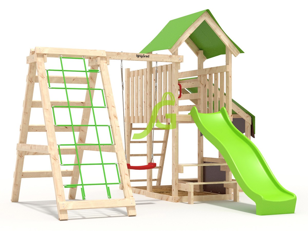 В комплект W9 входит: длина: 3,91 м, ширина: 3,88 м, высота: 2,65 м, артикул: igragrad-w9-v4. Все элементы обработаны защитным покрытием, безопасным для детей. Сертификация по ГОСТ.