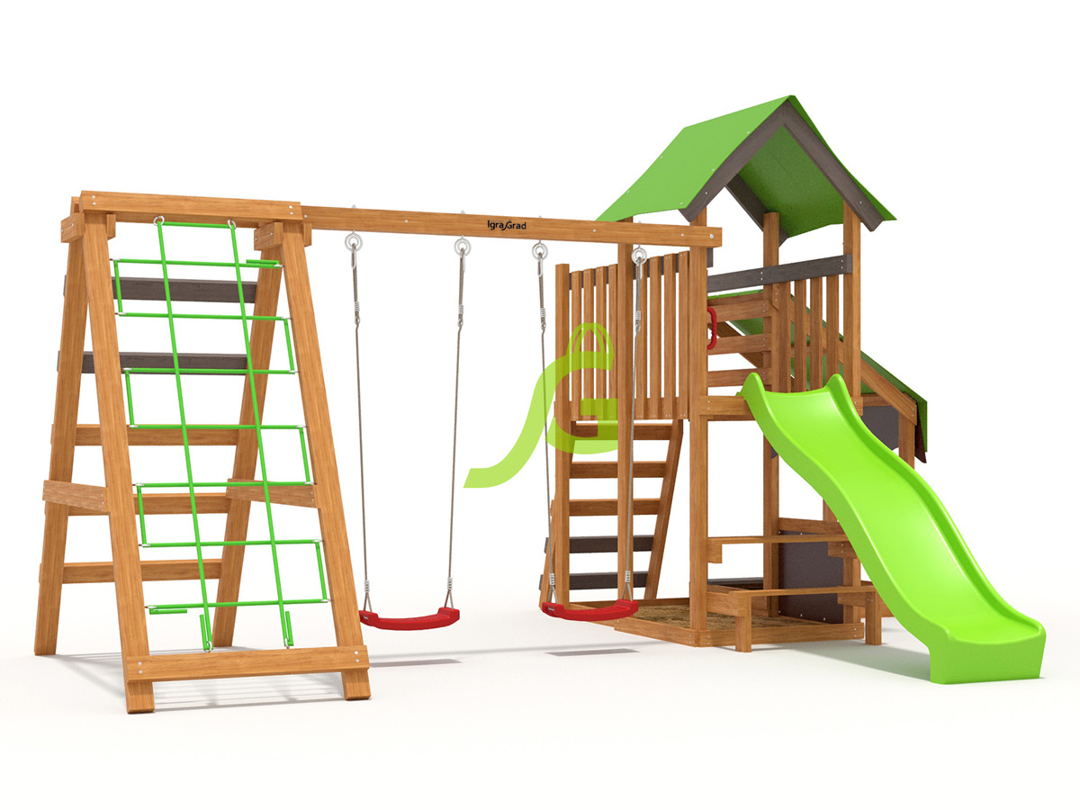 В комплект W9s входит: длина: 3,91 м, ширина: 4,62 м, высота: 2,65 м, артикул: igragrad-w9s-v4. Все элементы обработаны защитным покрытием, безопасным для детей. Сертификация по ГОСТ.