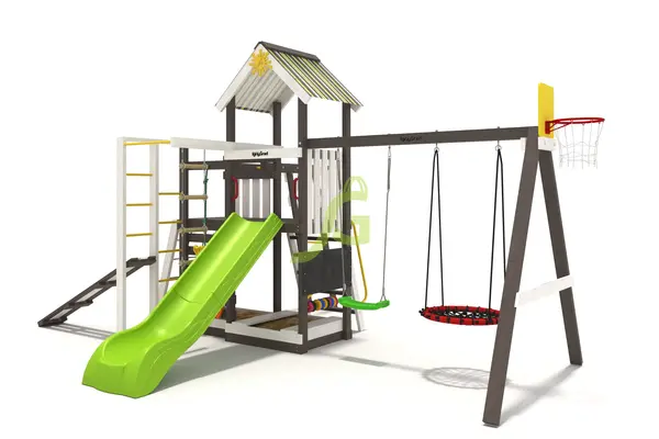 Игровая площадка X1 - это большой комплекс для детей от 3 лет, который подарит им целый мир приключений. Это многофункциональное решение для активного досуга на свежем воздухе, где каждый ребенок найдет занятие по душе. Комплекс X1 включает в себя башню с тентованной крышей, которая станет отличным штабом для игр и защитит от солнца. Захватывающая составная горка длиной 2,35 м подарит массу веселья. На качельном модуле расположены удобные качели-лодочка и просторное гнездо-паутинка. Для развития ловкости и силы предусмотрены скалодром с камнями, веревочная лестница и сетка для лазания, рукоход, шведская стенка, турник и гимнастические кольца. Также есть канат для подъема. Юные художники оценят доску для рисования и яркие счеты с 5 элементами. Площадка изготовлена из клееного бруса, который обработан безопасной пропиткой для защиты от влаги и вредителей. Все металлические элементы, включая крепеж, оцинкованы, что предотвращает коррозию. Конструкция соответствует требованиям ГОСТ, обеспечивая безопасность и надежность. Это значит, что вы можете быть уверены в качестве и долговечности площадки. Мы доставляем площадки по всей России. До терминала транспортной компании в вашем городе доставка бесплатна. Вы можете собрать площадку самостоятельно за 1-2 дня, следуя подробной инструкции, или воспользоваться услугами наших опытных мастеров. Стоимость сборки составит 20% от цены площадки.