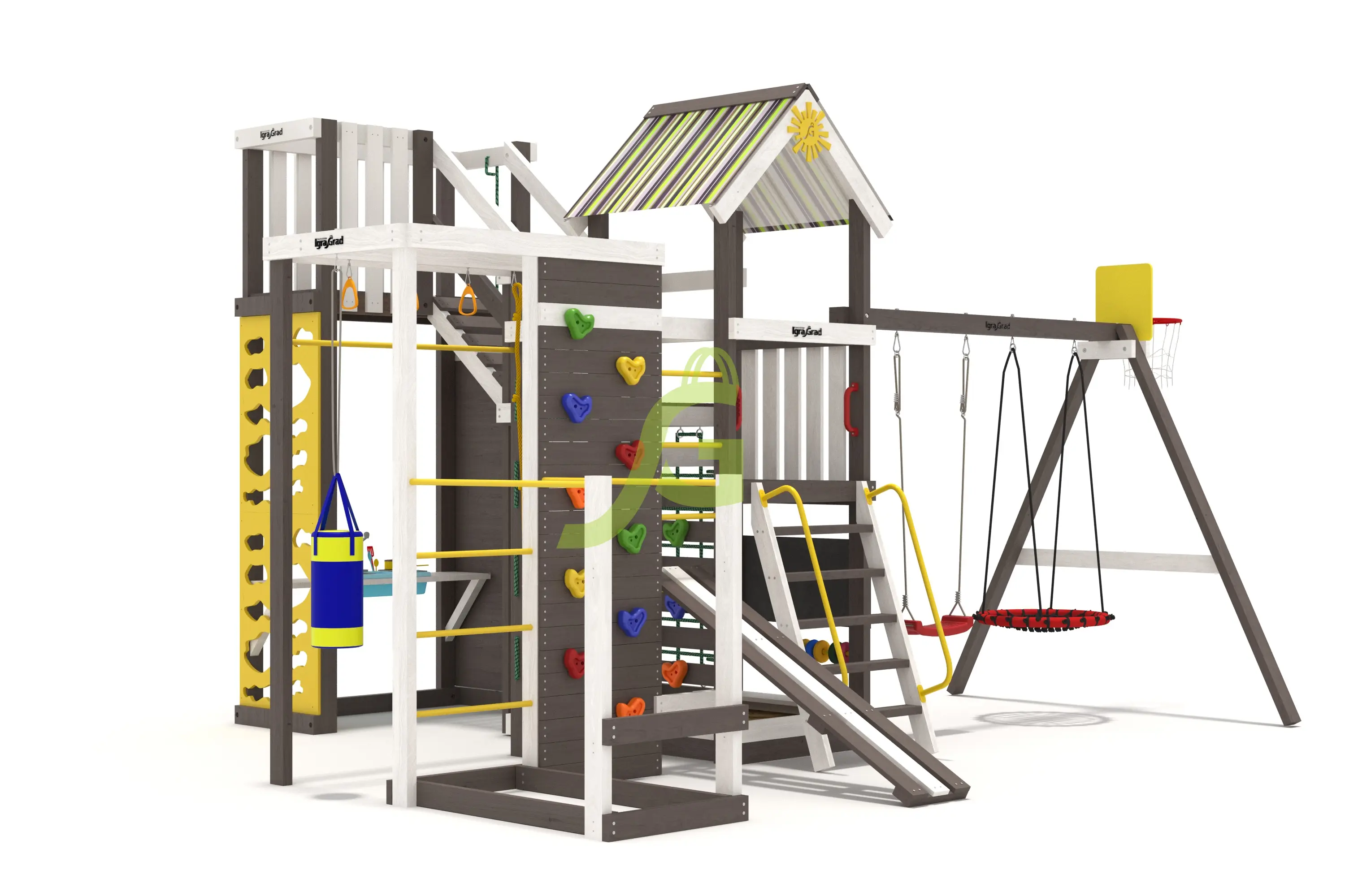 Площадка IgraGrad X5 (без трубы) - это полноценный игровой комплекс для детей от 3 до 12 лет. Она предлагает множество активностей, которые помогут вашему ребенку развиваться физически и проводить время на свежем воздухе с пользой. Конструкция площадки включает башню с тентованной крышей, качельный модуль с качелями-лодочкой и качелями-гнездом. Здесь есть три скалодрома разной высоты - 1,2 м и два по 2,1 м, а также две веревочные сетки и канат для лазания. Для спортивных занятий предусмотрен силовой блок со шведской стенкой, турником, брусьями и силовой скамьей. Дополнительные элементы - боксерская груша, доска для рисования и счеты - сделают игру разнообразнее. Все элементы площадки изготовлены из клееного бруса, который обработан специальной пропиткой для защиты от влаги, ультрафиолета и насекомых. Это гарантирует долгий срок службы и сохранение внешнего вида. Крепежные элементы оцинкованы, что исключает появление ржавчины. Конструкция разработана с учетом требований ГОСТ, поэтому вы можете быть уверены в безопасности вашего ребенка. Мы доставляем площадки по всей России. До терминала транспортной компании в вашем городе доставка бесплатна. Вы можете собрать площадку самостоятельно, это займет 1-2 дня, или воспользоваться услугами наших мастеров. Стоимость сборки составляет 20% от цены площадки.